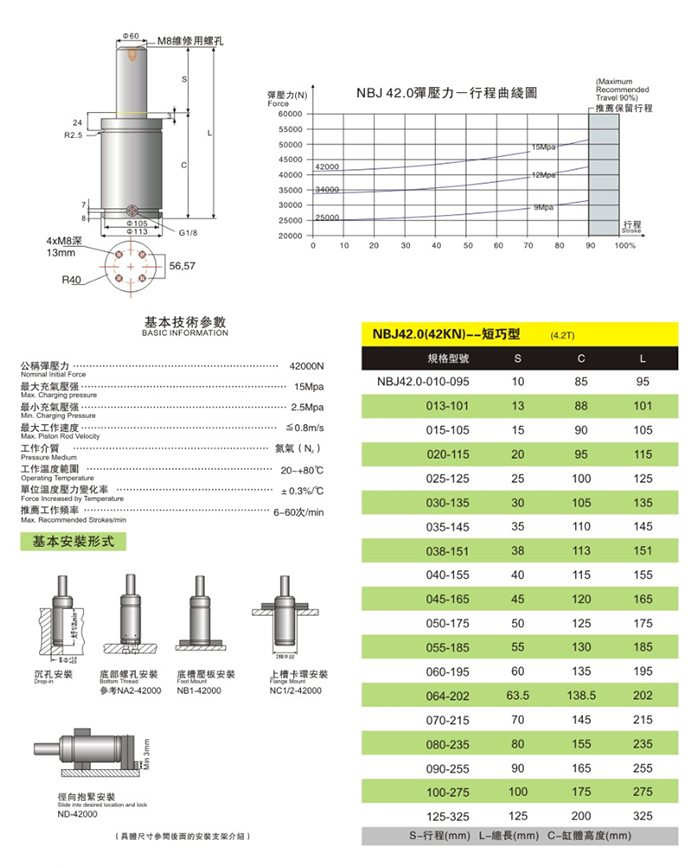 8、每一支氮气弹簧上都有建议的压杆压缩行程。当压杆的压缩行程不超过建议压缩行程时,产品的寿命将会提升。